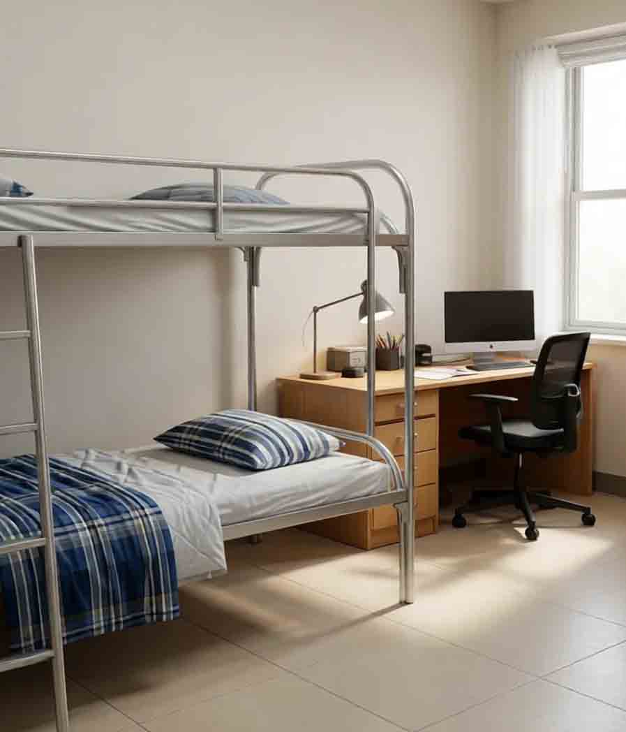 Оснащение общежитий требует практичного подхода и учета нормативных требований. В первую очередь подбирается мебель для жилых комнат: односпальные и двухъярусные кровати для общежитий, тумбы, шкафы, столы. Наиболее востребованы металлические кровати, так как они устойчивы к нагрузкам, просты в уходе и рассчитаны на длительную эксплуатацию. Размеры кроватей в общежитие подбираются с учетом площади помещений и плотности заселения.