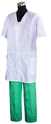 Костюм состоит из блузы и брюк. Блуза удлинённая прямая с застёжкой на пуговицы, с V-образным вырезом. Рукав короткий, два боковых накладных кармана. Цветные брюки прямого покроя, на резинке.