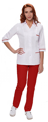 Костюм состоит из блузы и брюк. Приталенный блузон, выполнен в классическом стиле, с воротником. Вырез горловины V-образный, рельефные швы на полочке и спинке подчеркнут фигуру. Рукава длиной 3/4 на манжете с цветным кантом. Три втачных кармана оформлены кантом. Брюки зауженные книзу, пояс-резинка.