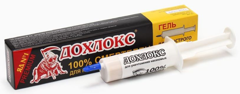 Средство для уничтожения тараканов известной марки Дохлокс. Выпускается в виде пластикового шприца со сверхсильным инсектицидом объёмом 20 миллилитров. Один такой шприц рассчитан на одно помещение площадью до 45 м². Полное уничтожение насекомых происходит, как правило, в течение вторых суток после использования Дохлокса.