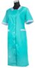 Халат прямого силуэта с центральной застежкой на пуговицы, без воротника, рукав короткий. Два накладных кармана. Отделка на горловине, рукавах и карманах украшают халат. Износостойкий, прост в уходе.