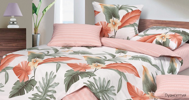 Комплект постельного белья Harmonica Пуансеттия ЕВРО, простыня на резинке 160*200, ткань сатин