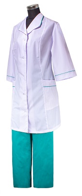Костюм состоит из удлинённого блузона и брюк. Блузон имеет V-образный вырез, воротник, рукав 3/4, два функциональных боковых кармана, сзади есть завязывающиеся хлястики. Застёжка — пуговицы. Воротник, карманы, манжеты рукавов отделаны кантом в цвет брюк. Брюки прямого фасона, пояс — резинка. Размер 60-62 Ткань тиси Состав 35% хлопок, 65% полиэфир