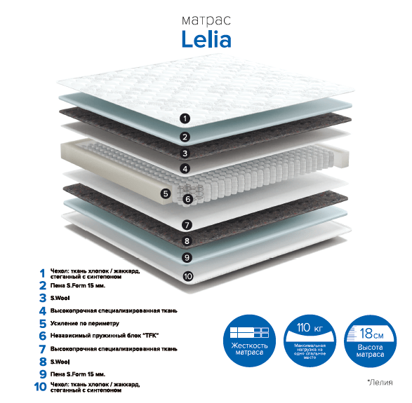 Матрас на независимом пружинном блоке «Лелия» ортопедический, очень удобный, в нём сочетаются все необходимые качества современного матраса. Жёсткость у матраса средняя. Система независимых пружин в форме бочонка, в которой каждый элемент упакован в отдельный кармашек. Пружины не соприкасаются друг с другом, матрас реагирует на нагрузку тела точечно, не создавая эффект гамака. Возникновение статического электричества внутри матраса сведено к минимуму, что способствует правильному кровообращению и здоровому сну. Настил из пенополиуретана толщиной 10 см, по периметру усилен специальным материалом, что не даёт краям сминаться и деформироваться. Чехол из жаккарда, простёганного с синтепоном. Матрас двусторонний.