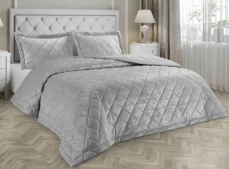 Красивый однотонный комплект для широкой двуспальной кровати состоит из стёганого покрывала и двух декоративных наволочек. Лицевая сторона – мягкий бархат, изнаночная – подобранная по цвету гладкая ткань, посередине – прослойка из синтепона, придающая изделию объём и мягкость. Слои скреплены между собой термостежкой в эффектную диагональную клетку. Край покрывала оформлен подворотом, наволочки с «ушками», обратная сторона наволочек выполнена из однотонной ткани с широким запахом, надёжно удерживающим подушку.