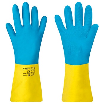 Сверхпрочные герметичные химически стойкие перчатки из неопрена и латекса ЭКСПЕРТ НЕОПРЕН обеспечивают отличную защиту при интенсивной работе с химическими веществами, представляющими повышенную опасность. Надежно удерживают скользкие предметы, так как имеют рельефную текстуру. Неопреновая поверхность увеличивает механическую прочность, а также сохраняет гибкость и эластичность в холодных условиях. Перчатки толщиной 0,46 мм большого размера 9 (L) выполнены в синем и желтом цвете. Имеют подкладку с хлопковым напылением. Длина — 330 мм.