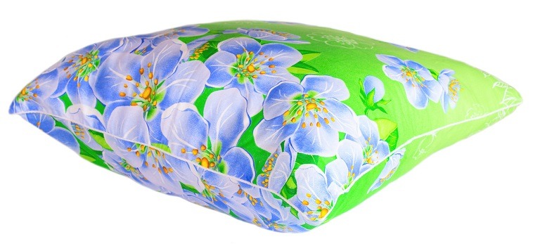 Подушка с наполнителем из полого силиконизированного волокна. Он придаёт подушке пышность, лёгкость и упругость, не вызывает аллергии, гигроскопичен, не препятствует циркуляции воздуха. Чехол бязевый цветной с кантом по периметру. Изделие можно стирать.