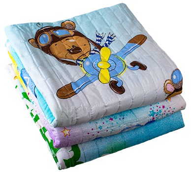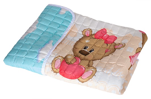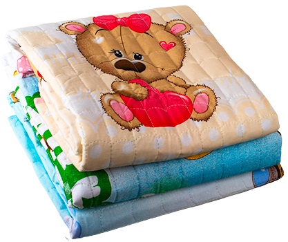 Покрывало стёганое из бязи. Между двумя полотнами хлопковой ткани размещается тонкий промежуточный слой — полиэфирное волокно. Двустороннее, с рисунком. Гипоаллергенное, приятное на ощупь, хорошо пропускает воздух. Идеально впишется в интерьер детской комнаты. Может служить лёгким одеялком для малыша.