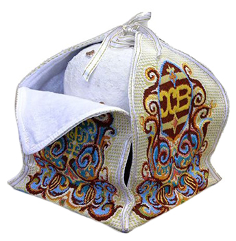 Украшенная лентой оригинальная гобеленовая салфетка для кулича с тематическим декором (содержит элементы православной символики, связанной с праздником Светлого Христова Воскресения). Она идеально подойдет на роль подарочной упаковки для пасхальной выпечки, и будет хорошо смотреться на праздничном столе. По форме салфетка напоминает купол церкви. Внутри салфетки подкладка из 100% х/б ткани.